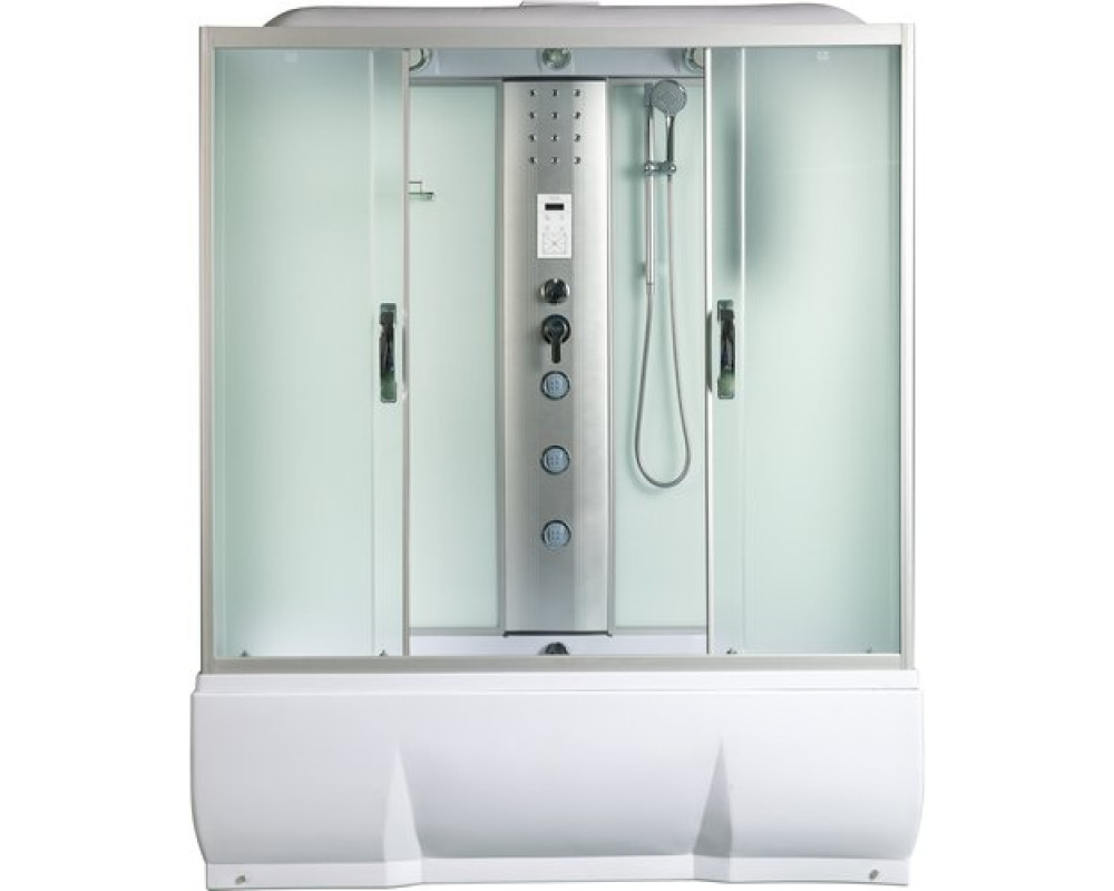 Размеры : 150x70х217 Тип кабины - Прямоугольная душевая кабина для пристенного монтажа Тип стекла - Закалённое травмобезопасное стекло 5мм Тип поддона - Акриловый поддон армированный стекловолокном на регулируемых ножках Цвет задней стенки - Матовое белое крашеное стекло Цвет передних стекол - Матовый Цвет профиля - Матовый хром Наружная высота поддона - 50 см(высокий)
