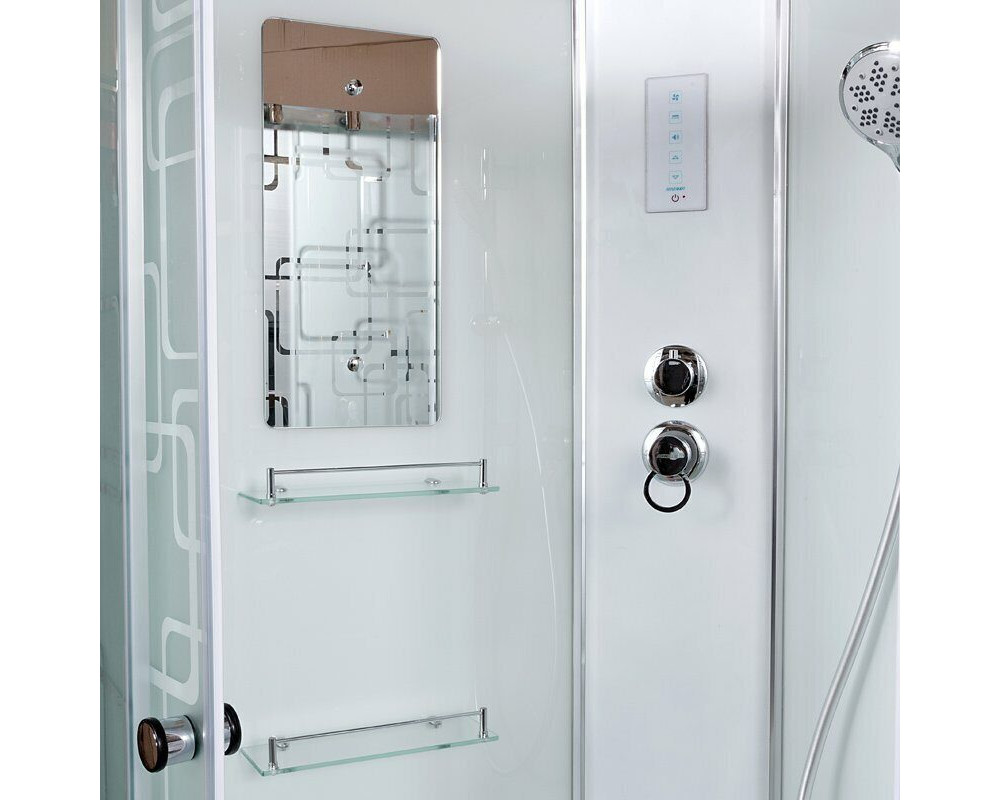 Вентиляция / Деревянная вставка в поддон / Душевой гарнитур / Зеркало / Переключатель режимов / Полочки / Радио / Сенсорный пульт управления / Смеситель / Тропический (верхний) душ