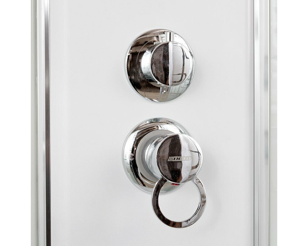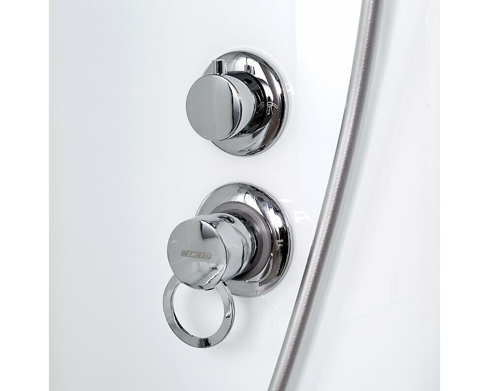 Стильная душевая кабина Deto EM 4580 с электрикой сочетает в себе высокую функциональность, практичность и надежность. Для изготовления применяют безопасное закаленное стекло толщиной 5 мм, надежно фиксируемое алюминиевым профилем. Цвет профиля хром. В комплекте зеркало, сенсорный пульт управления, донный клапан (клик-клак), смеситель, переключатель режимов, вентиляция, полочки, тропический (верхний) душ, радио.
